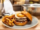 The Truffle Mushroom Bacon Cheeseburger is a mouthful - two beef patties, bacon, caramelized onions, mushrooms, mayo, truffle cheese sauce, topped w/ a panko crusted onion ring. served on a brioche bun.